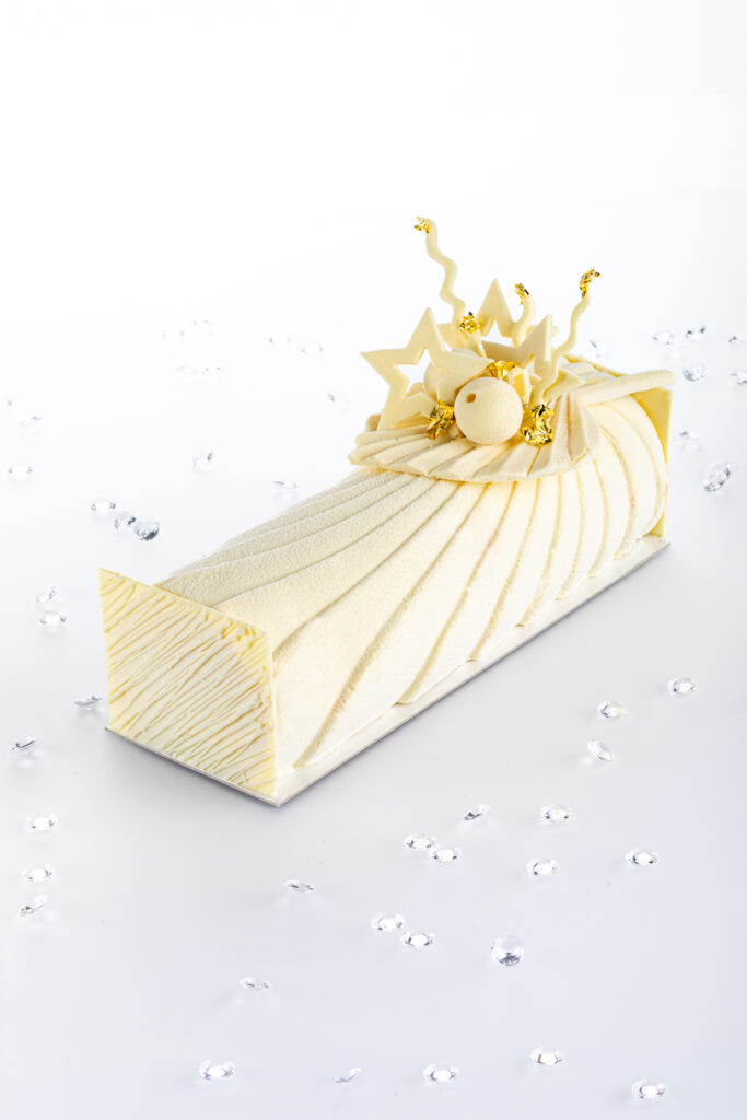 Une bûche glacée exotique et élégante, associant un insert sorbet passion intense, une crème glacée coco onctueuse et un pain de Gênes pistache moelleux, le tout délicatement pulvérisé de chocolat blanc et sublimé de touches dorées, pour un dessert frais et raffiné.